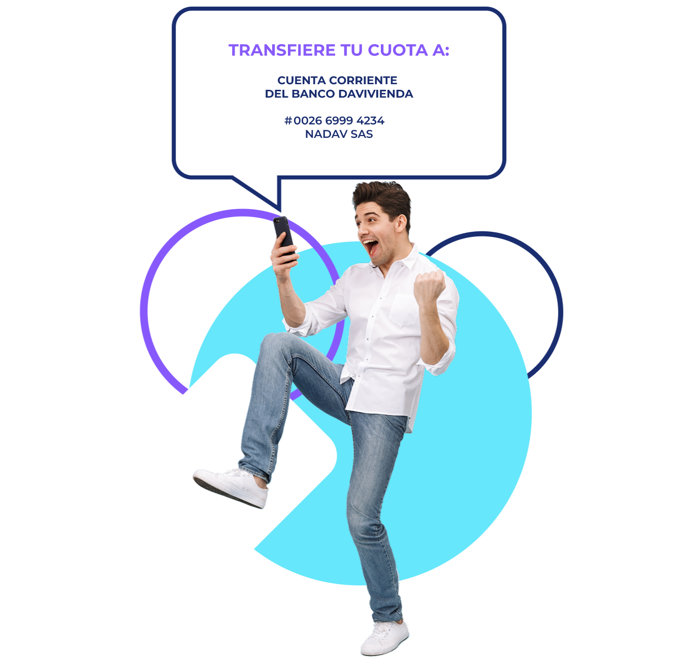 2. Realiza una transferencia o link de pago. Puedes efectuar el pago mediante transferencia a nuestra cuenta en el BANCO DAVIVIENDA a nombre de NADAV SAS y a la cta. corriente #0026 6999 4234. o también puedes solicitar el link de pago en nuestros canales de atención.
